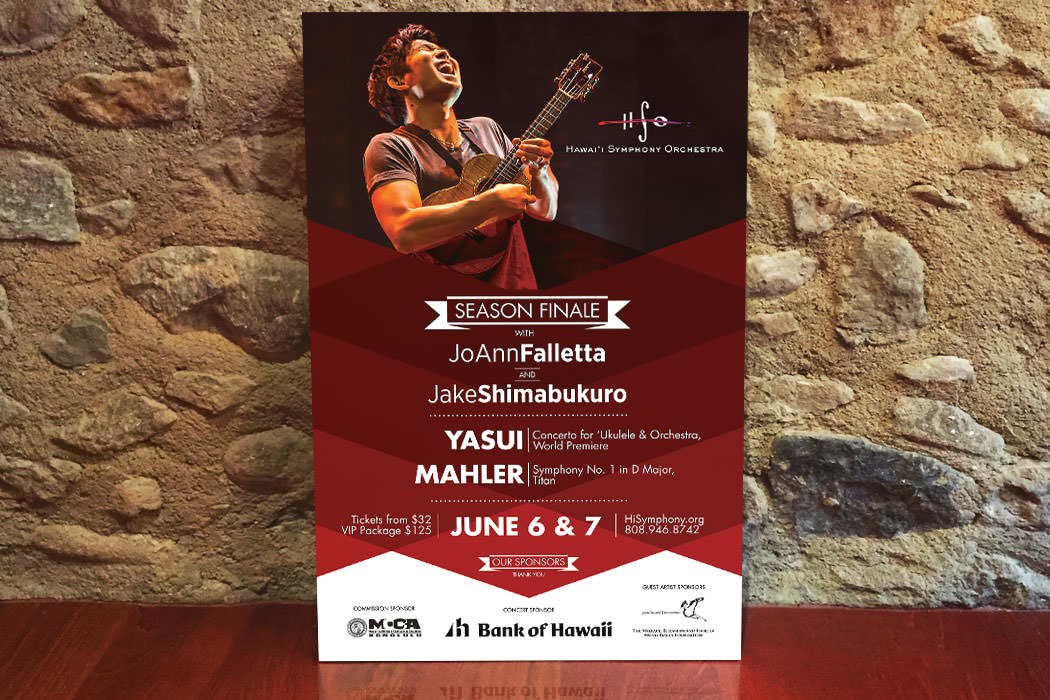 Creative developed for the Season Finale of the Hawaii Symphony Orchestra. Season Finale featured music interpreted in ‘UKULELE by Jake Shimabukuro and conducted by Joann Falletta. Poster, Print Ad and Social Media images.